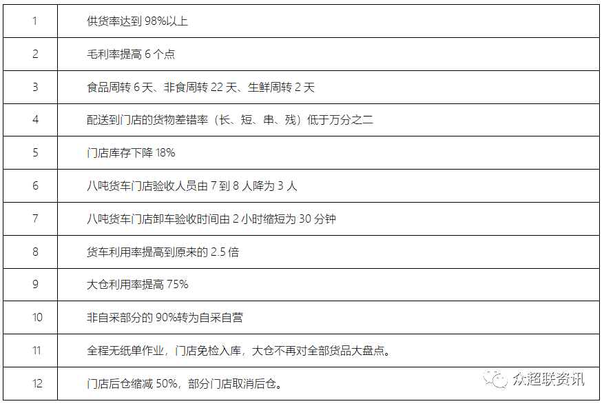连锁超市高效供应链在具体指标设计方面,主要有供应商供货率、物流中心对门店供货率、库存周转率、物流成本、配送差错率、配送及时率、人均劳效等等。例如某大型连锁零售企业通过对供应链的提升优化,达到以下指标: